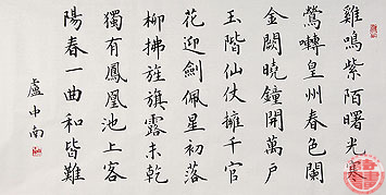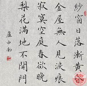 卢中南卢中南 1950年12月生于武汉,祖籍河南济源。中国著名书法家,享受国务院政府特殊津贴。现为中国书法家协会理事,中国书法家协会硬笔书法委员会副主任、楷书委员会委员,第十届、十一届全国政协委员,中国人民革命军事博物馆研究馆员,中国博物馆学会会员,中国诗书画研究会常务理事。 1986年,获全国第一届电视书法比赛一等奖。同年,作品入选《全国第二届书法篆刻展览》和《全国第二届中青年书法篆刻展览》。1987年,入选《现代国际临书大展》。1992年,入选中国书画研究院在日本举办的《中国现代美术书法优秀作品展》。1998年,入选国家文化部举办的《中日书法交流展》。2000年,作为中国书画家代表团成员出访香港,作品入选在香港举办的《中国当代美术书法精品展》。
