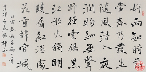 张坤山张坤山 笔名鲁子,1952年7月生,山东淄博人。国家一级美术师。任职于海军航空兵政治部文艺创作室。先后于1991年12月和2000年12月当选为中国书法家协会理事。现任中国当代书画艺术研究会名誉主席、中国东方书画院名誉院长等20余家全国性书画团体顾问、中国诗书画研究会常务理事。 书法创作五体兼擅,格调高古,个性鲜明,自成面目。数十次参加中国书法家协会主办的国家级权威大展,20余次在全国性大赛中荣获金奖。在中国文联主办的中国国际文学艺术博览会上被评定为书法类特级作品。荣立二等功、三等功各一次。作品收入《当代著名书法家精品集》、《当代中国著名书法家十人作品选》等百余部大型典籍。被中国文联授予“中国百杰书法家”荣誉称号。